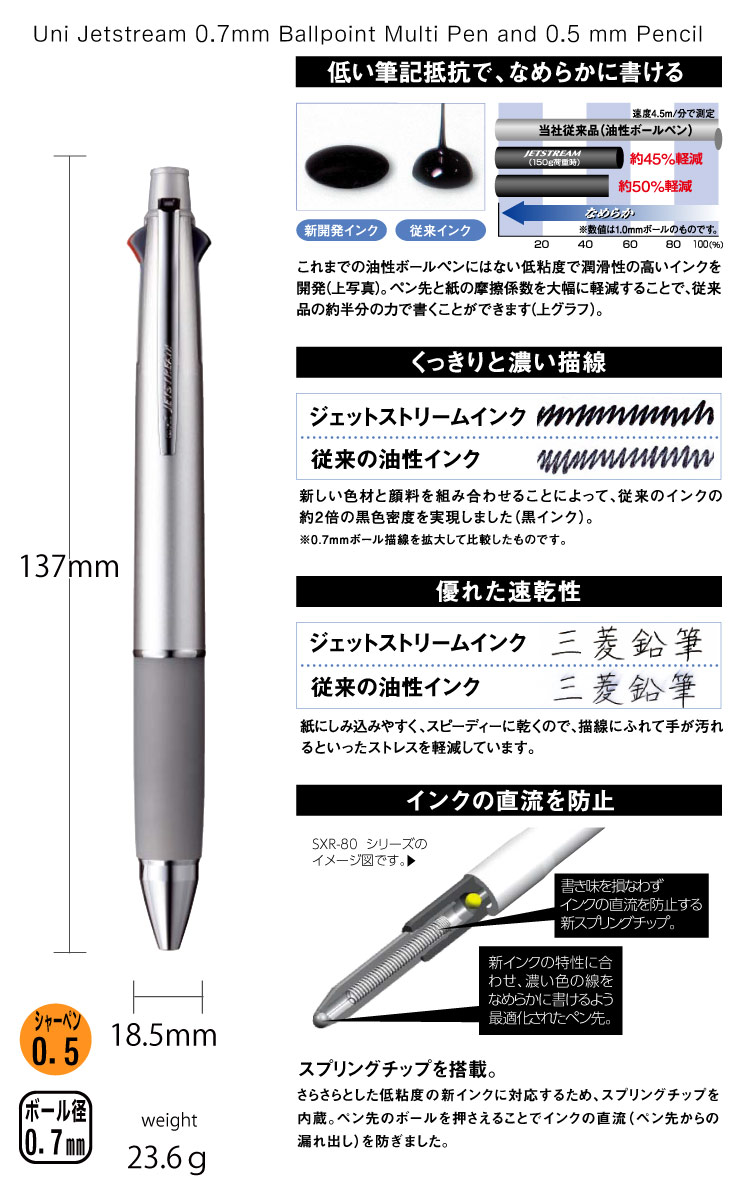 三菱鉛筆 多機能ペン ジェットストリーム 4&1 MSXE5-1000 0.7mm 商品特長 サイズ : 軸径 13.7mm ×厚さ 18.5mm ×全長 148.8mm 重量: 23.6g ボール径0.7mm/芯径0.5mm 「クセになる、なめらかな書き味。