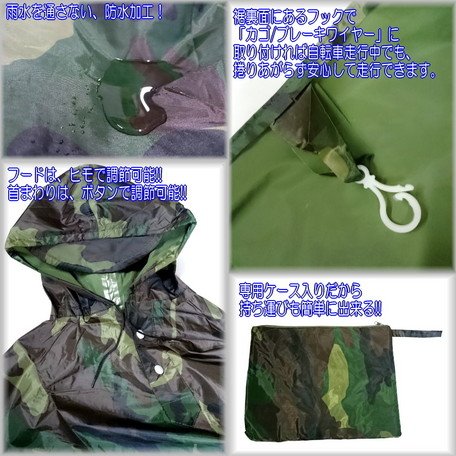 前面先端にクリップを装備!! 自転車に乗る際に、前かごなどに挟み込むと前面をカバーしながら自転車のハンドル操作が出来ます主な仕様 フリーサイズ(寸法詳細は画像に記載) 重量:迷彩色(約)410g(袋を含まず。